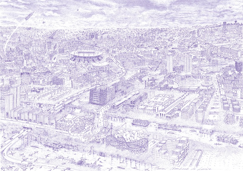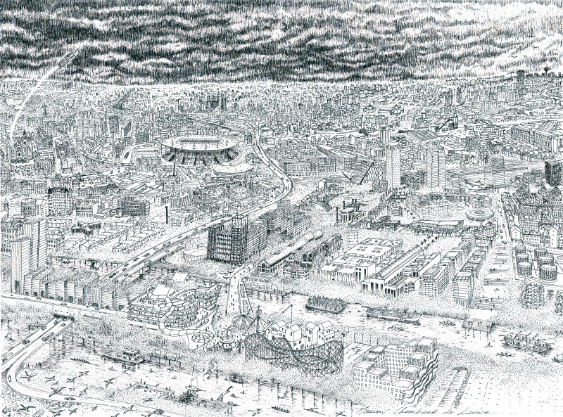 Ce dessin à l'encre réalisé pour les Jeux Olympiques 2024, mêle strates de temps et d'espaces, fiction et réalité, offrant une vue aérienne des communes de la Seine Saint Denis et au-delà. L'œuvre composite intègre les sites phares des Jeux Olympiques 2024 mais également les territoires qui les abritent.